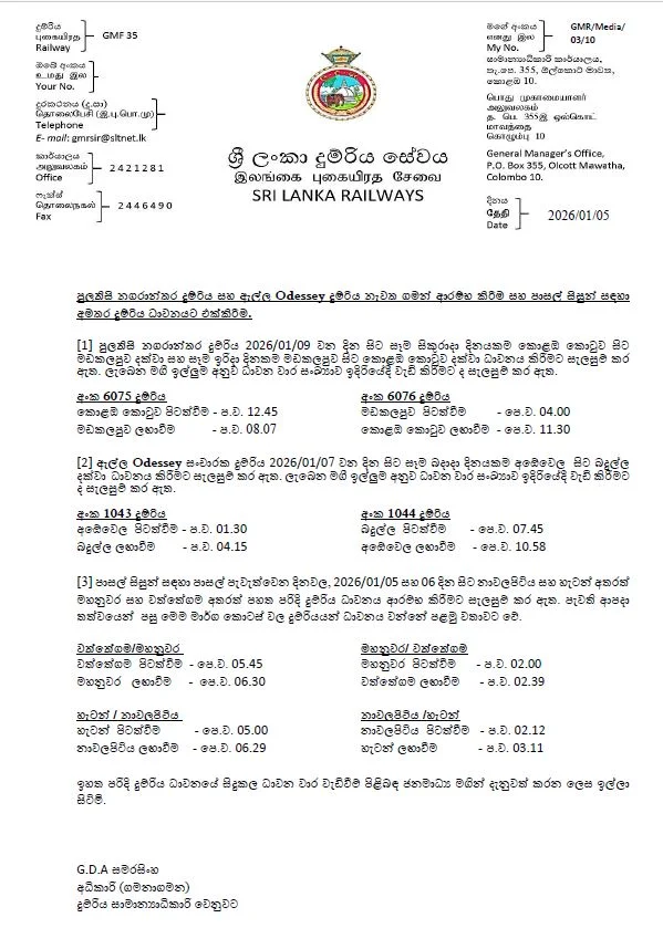 එමෙන්ම පුලතිසි නගරාන්තර දුම්රිය එළැඹෙන 09 වනදා සිට සෑම සිකුරාදා දිනයකම කොළඹ කොටුව සිට මඩකලපුව දක්වා සහ සෑම ඉරිදා දිනකම මඩකලපුව සිට කොළඹ කොටුව දක්වා ධාවනය කිරීමට සැලසුම් කර තිබෙනවා.