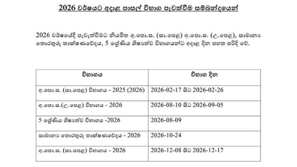 ඒ අනුව 2026 වසර සඳහා ජාතික විභාග 7ක් පැවැත්වීමට නියමිතය.